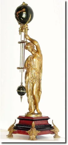 C.1885, French, Gilded Bronze Swinging Mystery Timepiece on a rectangular two color marble base (red and black), with ormolu feet. This is a very nice example of an earlier swinger on original bronze statue. Wear to gilding, but with nice patina on all surfaces; height 25'