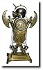 C.1885, French "Gladiator" Form clock in very good original condition. This is a detailed piece, with 2-mace, 2-axe and 2-shields, the whole surmounted by a nickeled helmet with engraved brass face plate. The front shield is deeply engraved with a lion and a falcon, the rear shield with 5 stars accented with scrolls. The time only movement has a cylinder platform intact, but would benefit from service. The intricate cast dial has numerals painted on and with some wear and with fancy cast hands. Height 19" $900-1200