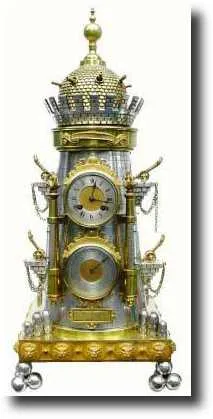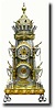 clock and barometer in a very unusual form. The "fort" is a round brick tower (silvered brass), with parapets with 4 flaming canon, and the rotating top carousel with armor and 8 canon which in the original were fired in quick succession, the empty canon being re-loaded in the time it takes to travel full circle. The 4 feet are each stacks of 4 canon balls, and above stand the packaged powder charges. Flanking the dial are two larger canon. The canon are non-firing, and under the top carousel is a spring motor, which turns the canon assembly for a time. The 8-day time and strike movement has a balance/platform escapement, and is running but would benefit from service. The movement is slightly loose in its sleeve. We have not seen this clock before, and are estimating it with the rarer automatons. Height 26" $10,000-12,000