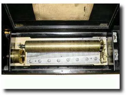in generally good condition. This is a large box with 13" cylinder, playing 12 popular tunes of the era: 1) Over the Garden Wall, 2) Pinafore, 3) War ...