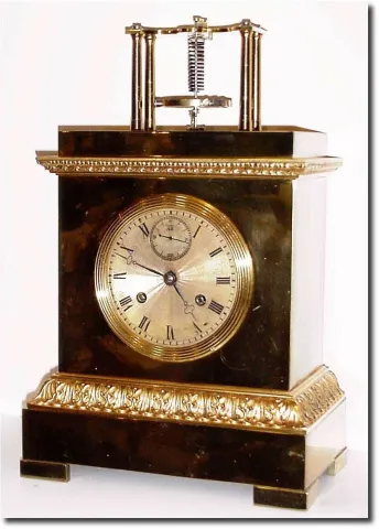 C.1885, French, Pons, Seconds Beating, Balance regulator. The polished brass case in simple Greek form, houses a large and well made round bell strike movement, controlled by a detached balance, suspended at the case top, the lever arm rising through a hole in the roof of the case, the impulse pin engaging in a slotted disc on the balance shaft. The balance is sprung with a helical spring, well over an inch high and of large proportions, so that the coiling and uncoiling of the spring is quite visual. The main balance is 2.25' diameter, adding for the rating screws, it is 2.7' in diameter. A rare and unusual mantel regulator; height 14.25'