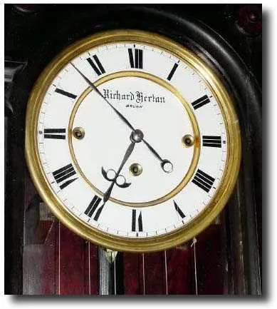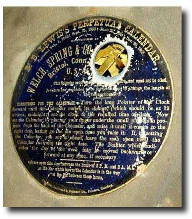 an unusual wall hanging double dial calendar, made by Welch "Expressly for L.F. and W.W. Carter" (as stated on label). This model is similar to a shel...