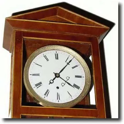 with baroque style trim on the door. This clock has been in storage and will need cleaning and detailing, but it is all original and has a lot of pote...