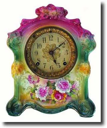in good+ original condition. The porcelain dial has a little damage around the winding holes. The clock has a beautiful door glass with 24k gold patte...