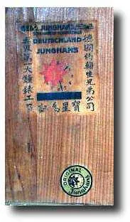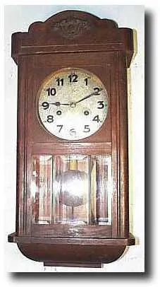 oak case 21 inches by 10 inches, with a 5 inch diameter metal dial. Made for the Asian market.The back of the clock also has a terrific Junghans label...