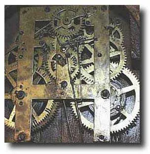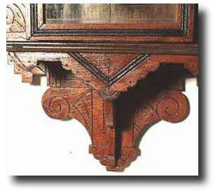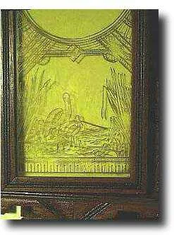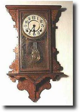 Eight day brass movement is signed by the Waterbury Clock Co. and dated Sept. 22, 1874. An original reverse painted glass in the front door shows cran...