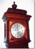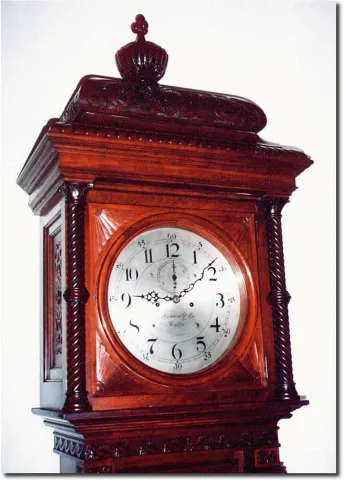 When the fellows helped Ly estimate the values of these tall clocks, they obviously had not seen this particular one, as I believe their estimate of $11,000 is inadequate. This clock is from a home here in New Hampshire. It has been idle for a while and will need cleaning. However, the quality of the carving on the mahogany case is unbelievable. What is not obvious from the catalog picture is that the carving is on all 3 sides of the hood. The glazed door has swelled a little in the humid weather, and may need relief to close. 14' silvered dial is original and untouched as is the exterior finish. Beveled glass in door, 2-weight, 8-day. A Howard collector"s dream. Height 8-ft, 9-in. Additional keywords: longcase, tallcase, grandfather