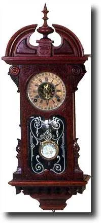 Walnut case with applied burl and carved walnut decoration in old finish. Paper dial. Label on back reads: Manufactured by Wm. L. Gilbert Clock Co., W...