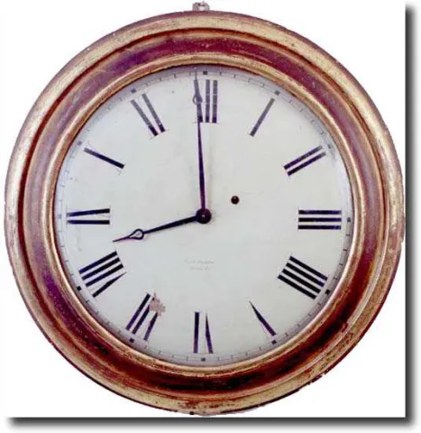 Gold leaf case, painted wooden convex dial signed E.A. lngraham, Bristol, CT Eight-day time-only brass, spring-driven movement Original convex glass. ...