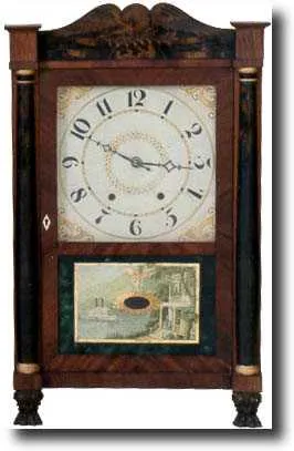Mahogany case with carved paw feet applied stenciled half columns, stenciled eagle crest with cannons. Old finish and patina. Old tablet and painted w...