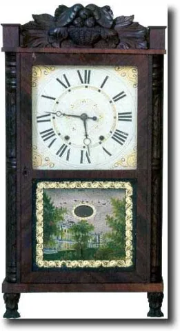 Mahogany case with carved paw feet carved quarter columns, with basket of fruit crest in old finish and patina. Original tablet painted wood dial. Cle...