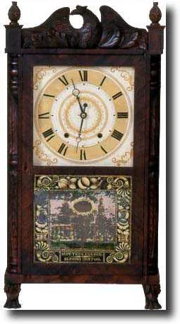 Mahogany case with carved paw feet applied and turned quarter columns, carved eagle crest and pineapple finials. Case in original finish, and original...