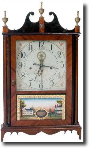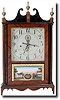 Figured mahogany case with inlaid birch panels and original finials. Extra-nice label reads: Invented, made and sold by Eli Terry, Plymouth, CT Painte...
