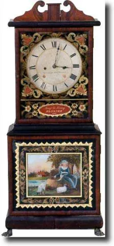 Mahogany case in old finish with original brass paw feet. Old reverse painted tablets, and original painted dish dial. Signed on dial: warranted for J...