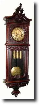 with restoration. Note the top 6" carving and the "tail" carving are nicely carved replacements; the case has been refinished to a dark mahogany color. The well made Viennese movement is original to the case and retains its original dial, with nicely engraved center and with gilt and engraved mask over the silvered chapter ring. In spite of the restoration, this is an above average clock, with popular "double door" styling, and in running condition; with old wooden handle crank; height 52" $1500-2000