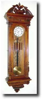 in walnut, by Ignatz Nowak, Wien. This clock has had a new top carved by a Viennese cabinet maker and he did quite a nice job. You probably couldn't tell, except that he forgot to put dowels in to hold it on, and the color is a bit dark. This is a long, 72 beat clock, and with an attractive carved panel in the case back. The stabilizers are missing (retainers are there); the clock is otherwise complete, and with an outstanding movement, mounting on two gilded brackets with thumb screws. Also with key lock door (with key!). The gut is failing and will need replacing soon. Despite the new top, we would classify this as excellent. Height 58" $2000-2500