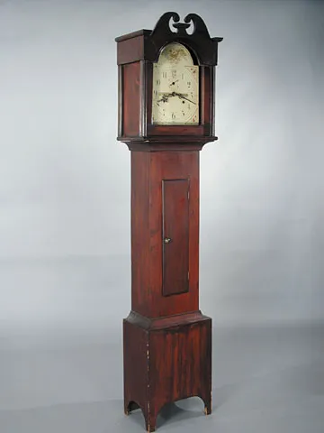 Wooden works with good original painted dial. Stained case. Hood having broken arch pediment. This clock, before taking out of a fine Augusta home, ha...