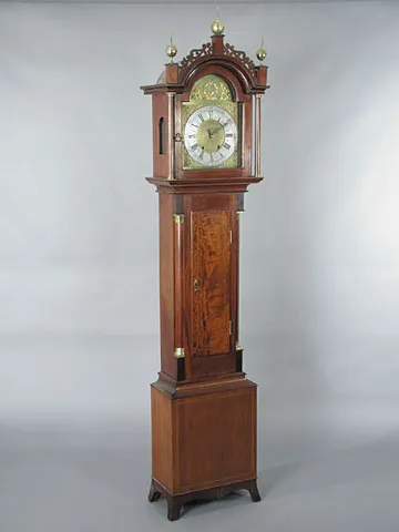 Brass face with name and location on dial. Custom-built hepplewhite-style case signed "W. R. Durfee, Darle Harbor, Maine". Case has inset quarter colu...