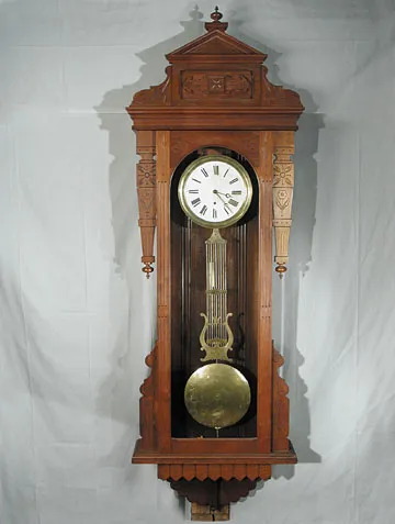 Unmarked dial has been replaced which probably indicated maker. Large pendulum stamped "161". Single weight driven. Eastlake case decorated with incis...