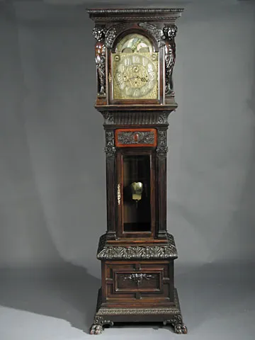 OUTSTANDING WALTER H. DURFEE TALL CLOCK WITH OUTRAGEOUS CARVING TO CASE