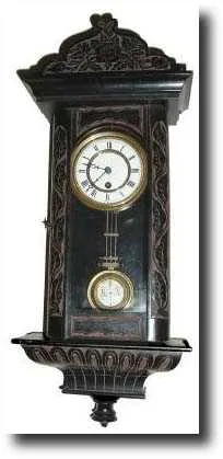 in good original condition. This walnut case has been ebonized and then carved with fine floral detail on all surfaces, sides and bottom. The little movement is finely made with 7 wheels to achieve the week duration with short pendulum. The porcelain dial center has a crack; the chapter ring is fine; bezel good.. Retains original hands and winding grommet (often missing). Note bottom finial has been crushed and the several pieces glued together; may need a different one. Height 15" $1400-1800