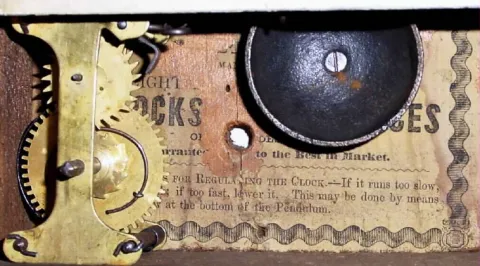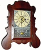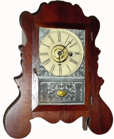 C.1853, E. and A. Ingraham 30-hour time/alarm miniature lyre front shelf clock.