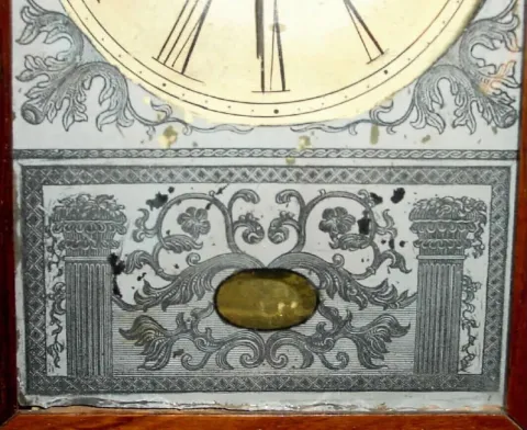 This cute refinished clock is veneered in mahogany and rosewood. There is a little veneer damage on the door. The label is about 1/4 flaked away, but ...