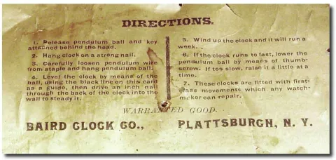 C.1890, Baird Clock Co., Plattsburgh, NY, clock advertising Clapperton"s Six Cord Spool Cotton, Geo D. Ross and Co., Agents, Montreal. This clock has been repainted a color with more purple than the dark maroon inside, and scrollwork on the lower door was incorrectly gilded. The ad slogan itself is not repainted (painter went "round the letters carefully). Now the rest the clock is super, original dial and label. For further details, refer to Baird Advertising Clocks by Jerry Maltz, pages 20-21. If this had the original paint, we would expect it to bring $2000. Height 30'