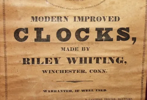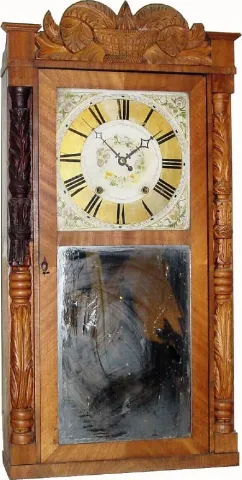 C.1835, Riley Whiting, Winchester, Conn., 30-hour wood movement carved case shelf clock,