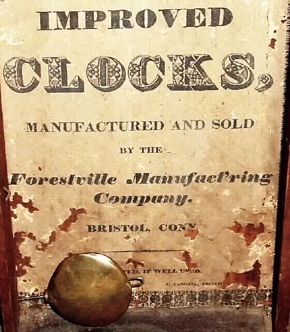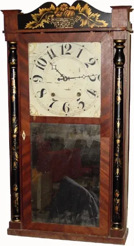 C.1835, Forestville Mfg. Co., Bristol, Conn., 30-hour wood movement half-column and splat shelf clock.