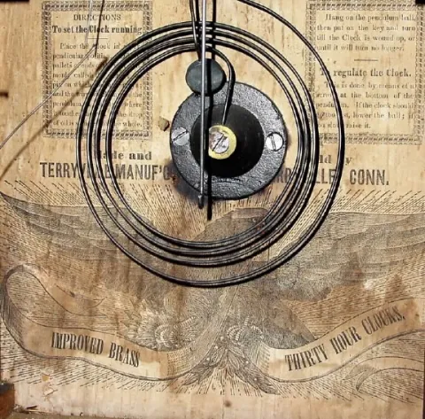 Silas Terry started the firm in 1853, but this clock was probably made after his cousin, Theodore took over the firm in 1854. This unusual movement ha...