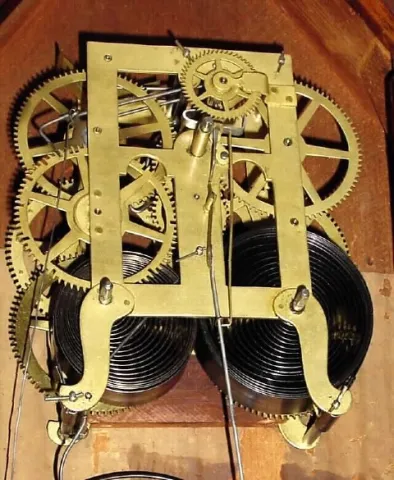 The case has rosewood veneered front and mahogany veneered sides. Veneer is exceptional except for the flat base which is missing the veneer and has b...