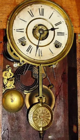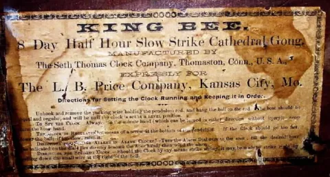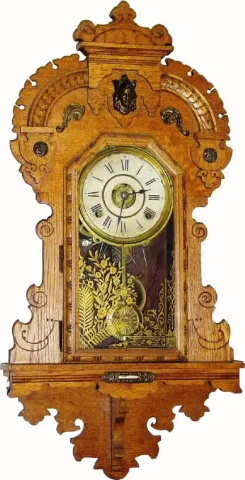 C.1905, Seth Thomas Clock Co., "King Bee" 8-day time/strike/alarm Oak hanging gingerbread clock, in excellent restored condition.