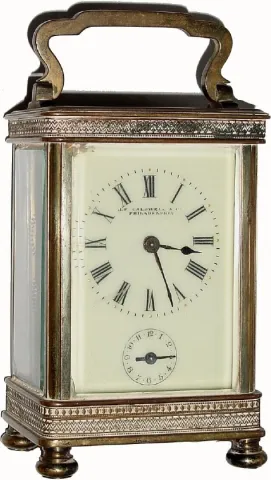 , for J. E. Caldwell, Philadelphia. This is a time and alarm in a cute case with turned bun feet and finely embossed bands around the top and base mol...