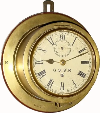 the dial and brass flange identified with the letters "GSSR", now mounted to a board with hanger. This has a heavy fusee movement, with an English lev...