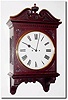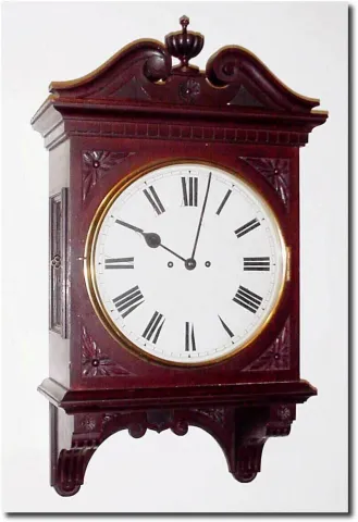 C.1890, English, 2-Fusee, Mahogany cased wall clock, in an attractive case with carved floral trim, carved base bracket, fretted and hinged side doors and a broken arch top with fluted center finial. This clock needs a pendulum; otherwise it is in excellent original condition, the heavy and well made double chain fusee movement a monument to English clockmaking supremacy. Striking on a heavy coiled flat-wire gong with very deep tone. Original 12 inch painted dial; Height 29'