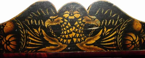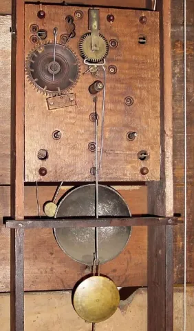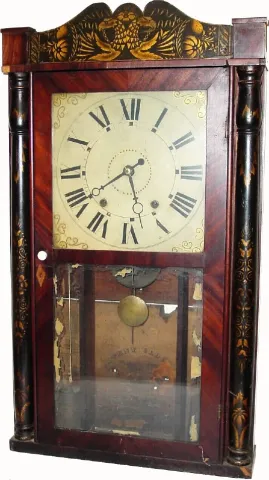 C.1833, Eli Terry, Jr., Terryville, Conn., 30-hour wood movement half column and splat shelf clock, in fair condition.