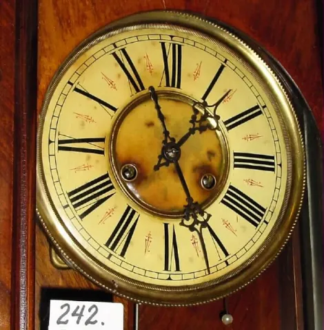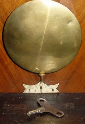 The cello covered dial is discolored in the center; chapter ring is OK. Case is missing its entire top trim. Strikes the hours and halves on a coiled ...