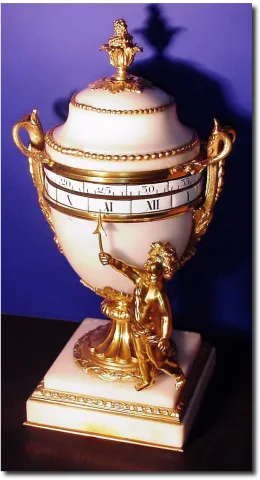 The platform lever movement drives the horizontal chapter rings in a circular motion, while the "hand' is a fixed pointer in the cherub"s hand. All of the ormolu trim has been recently gilded, and there are two repairs to the top beading, also there is a small "filling' repair along the top edge of the urn that is only noticeable on close inspection. Still this is a rare clock, and a welcome addition if you do not already have an annular dial clock. Height 10'