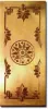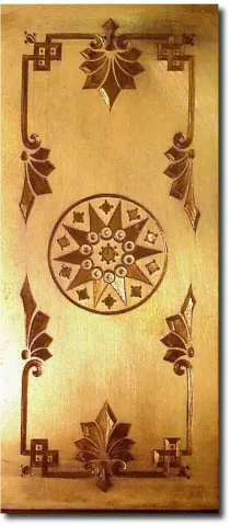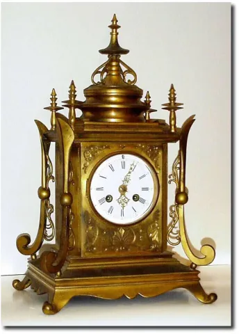 C.1890, French, Architectural form, all ormolu clock, in interesting temple motif, with profusely engraved case. See lot 274 which is undoubtedly by the same maker. This clock has fancy flying buttresses at each corner, while 274 has simple turned columns. The engraving on 484 is geometric with stars and square patterns, while 274 has a floral motif. The only flaw in this clock is that it received rough handling in shipment and the porcelain dial has several hairlines (not too noticeable). Attractive blue numerals on dial, and well chased hands. Height 13.5'