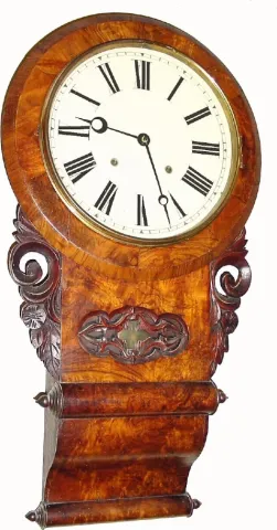 C.1870, E.N. Welch 8-day time and strike English cased walnut burl wall clock.