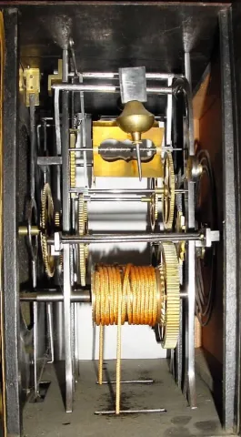 This is an anchor escapement model with gong strike, the gong attached to a board on the rear. The embossed brass dial surround depicts a group of you...