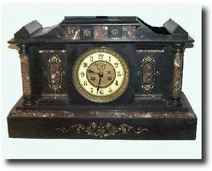 in very good condition, with original gold filled incising intact. Has lots of contrasting brown onyx trim, and full round columns on each side. Retains original open escapement dial, with winding grommets and with attractive stylized numerals. Note F/S rod is absent; adjust from rear only. This a very heavy clock and should not be shipped; pick-up in Salem is recommended. Strikes the hours on a flat wire gong. Ht11 inches, W18" Reserve $300