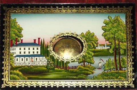 The scrolls appear original; the tips have been repaired and scrolls re-veneered (well done). The reverse painting is new but looks to have been paint...