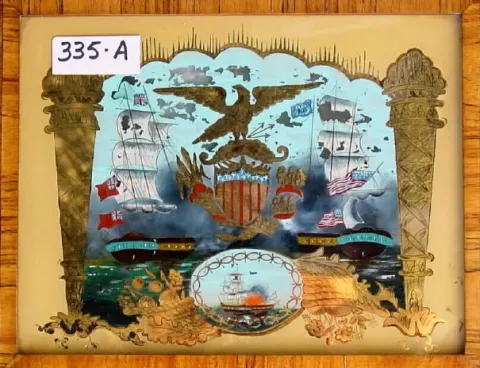 The lower tablet with British and American naval battle is flaking and will eventually need professional attention. The clock retains original dial wi...