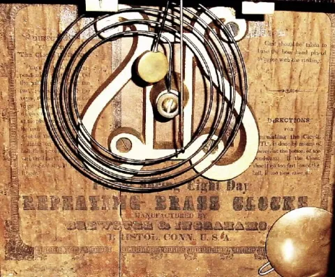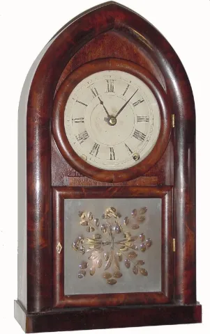 C.1844, Brewster and Ingrahams, Bristol, Conn., 8-day Kirk's Patent iron backplate beehive shelf clock.