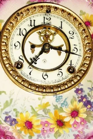 The colors are very striking on this clock, a deep reddish purple around all of the edges and the floral decorations are yellow daisies amongst purple...