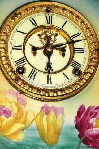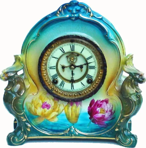 C.1905, Ansonia, La Charny, Royal Bonn porcelain china clock in excellent original condition.