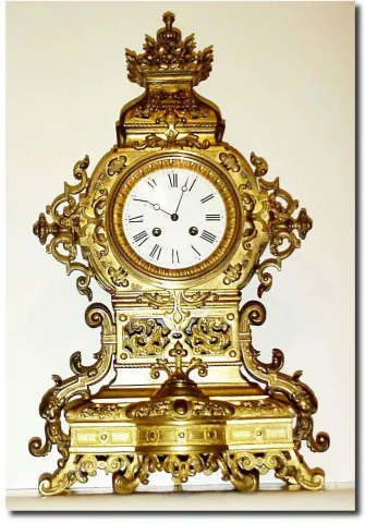 C.1890, French, Bronze Architectural mantel clock, with extra fancy detail., the central tower pierced and with profuse use of scrolls and teardrops, and two pierced baskets leading to a fluted finial at the top. And with a good striking movement with a perfect porcelain dial and original hands. Very imposing; height 20.6'