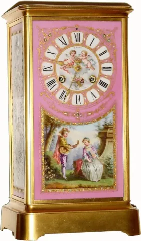 with Sevres panel dial and side panels, the rear with a beveled glass for viewing the movement. This clock is in outstanding original condition, and s...